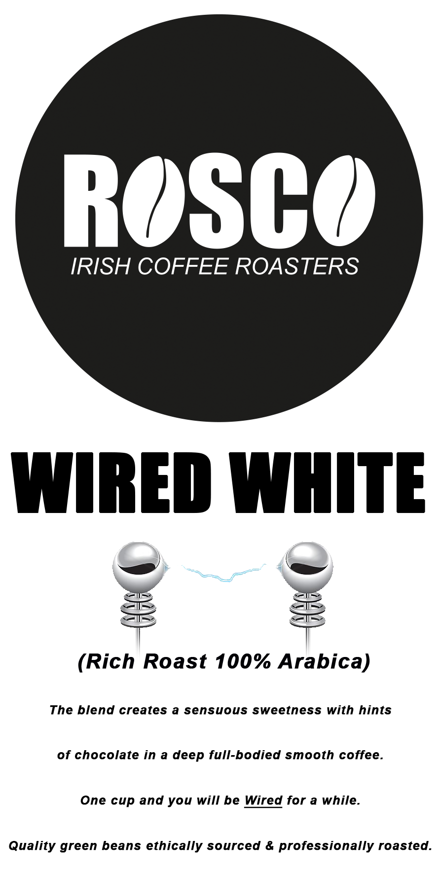 Wired White: Is a rich roast using Arabica and Robusta beans to create a sensuous sweetness with hints of chocolate in a deep full - bodied smooth Coffee. One cup and you will be Wired for a while.....